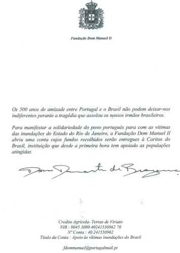 Para manifestar a solidariedade do povo português para com as vítimas das inundações do Estado do Rio de Janeiro, a Fundação Dom Manuel II abriu uma conta cujos fundos recolhidos serão entregues às Caritas do Brasil, instituição que desde a primeira hora tem apoiado as populações atingidas.