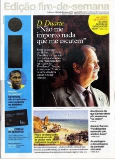 A entrevista de João Céu e Silva ao Senhor Dom Duarte publicada na revista Notícias Sábado do Diário de Notícias, confirma um competentíssimo jornalista e revela um entrevistado culto e sabedor, com uma interessante e desempoeirada visão sobre os grandes temas políticos da actualidade. Estranho no entanto a parangona de primeira página com uma frase descontextualizada, a respeito das fatais questões de costumes tão na moda. De resto ao longo do artigo esses temas são explorados e destacados ao limite, coisa que não me parece inocente, seja por razões políticas ou comerciais. Tal não seria um problema se os temas “fracturantes” sobre os quais o Duque de Bragança possui uma opinião legitimamente conservadora, não tendessem a esbater a importância doutros, politicamente bem mais reveladores e urgentes sobre a complexa realidade que aflige os portugueses. Essa análise, preparada e perspicaz está lá, nas linhas e nas entrelinhas, para quem quiser ler.